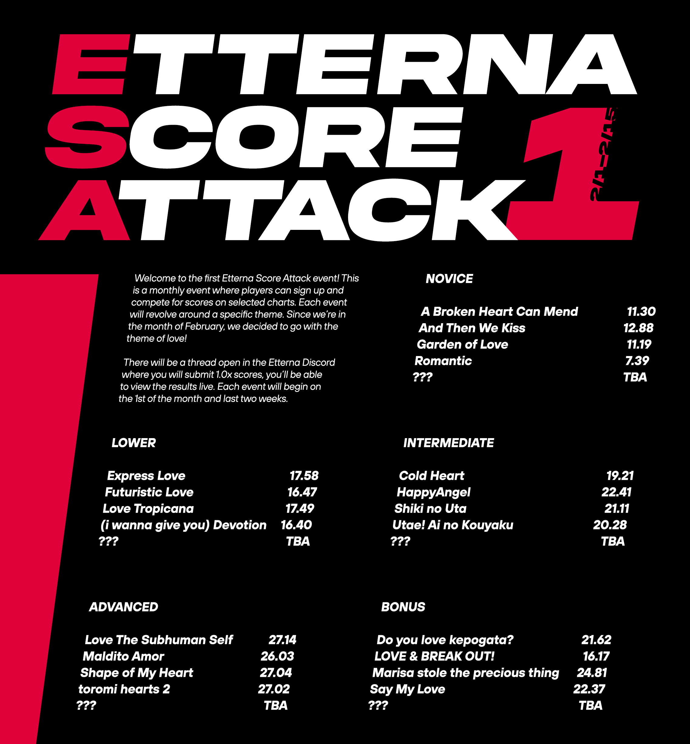 Since we’re kicking things off in February, the theme for this season is love. Each future season will feature a completely new theme, with its own unique chart selection. This event was heavily inspired from Premere Bottoni’s BMSA event, which is where the rating system comes from.